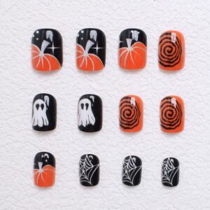 H002 Beauty Tips 24Pcs Press On Acrylic Nails Decorated with pumpkins, stars, moons, and black blood drips