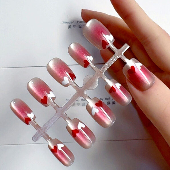 Beauty Tips cat eye Press-On Nails with Heart Design, Pink Ombre Gradient, 10 Pcs, short. Size M. CE5005