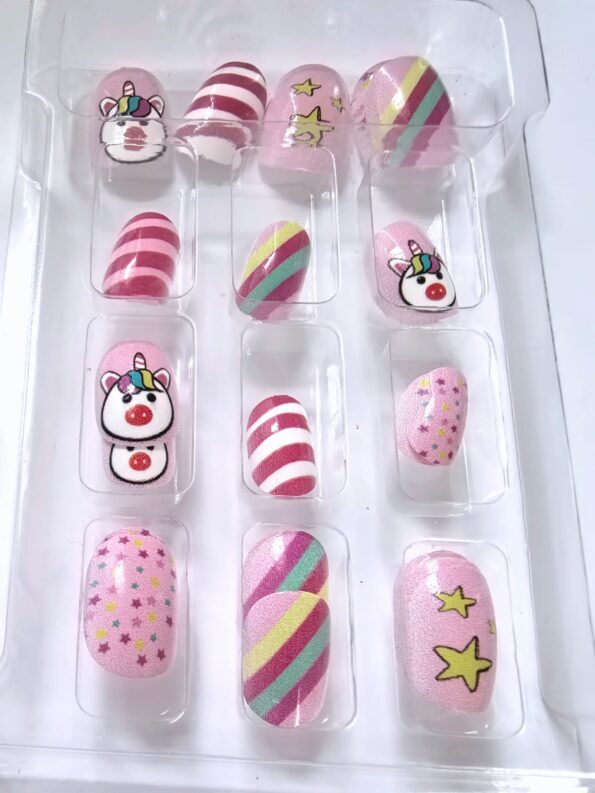 Beauty Tips 24pcs reuseable artificial pink press on false nails for kids Teenages or small fingers.Rainbow Unicorn Series(Pink stripe, 13)