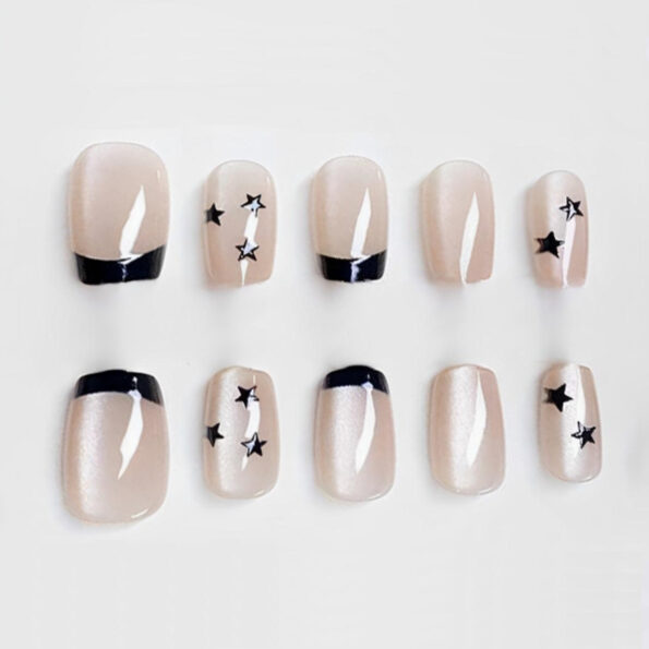 Beauty Tips cat eyes Press-On Nails, French Tip with Black Stars Design, Nude Pink Base, 30 Pcs T126